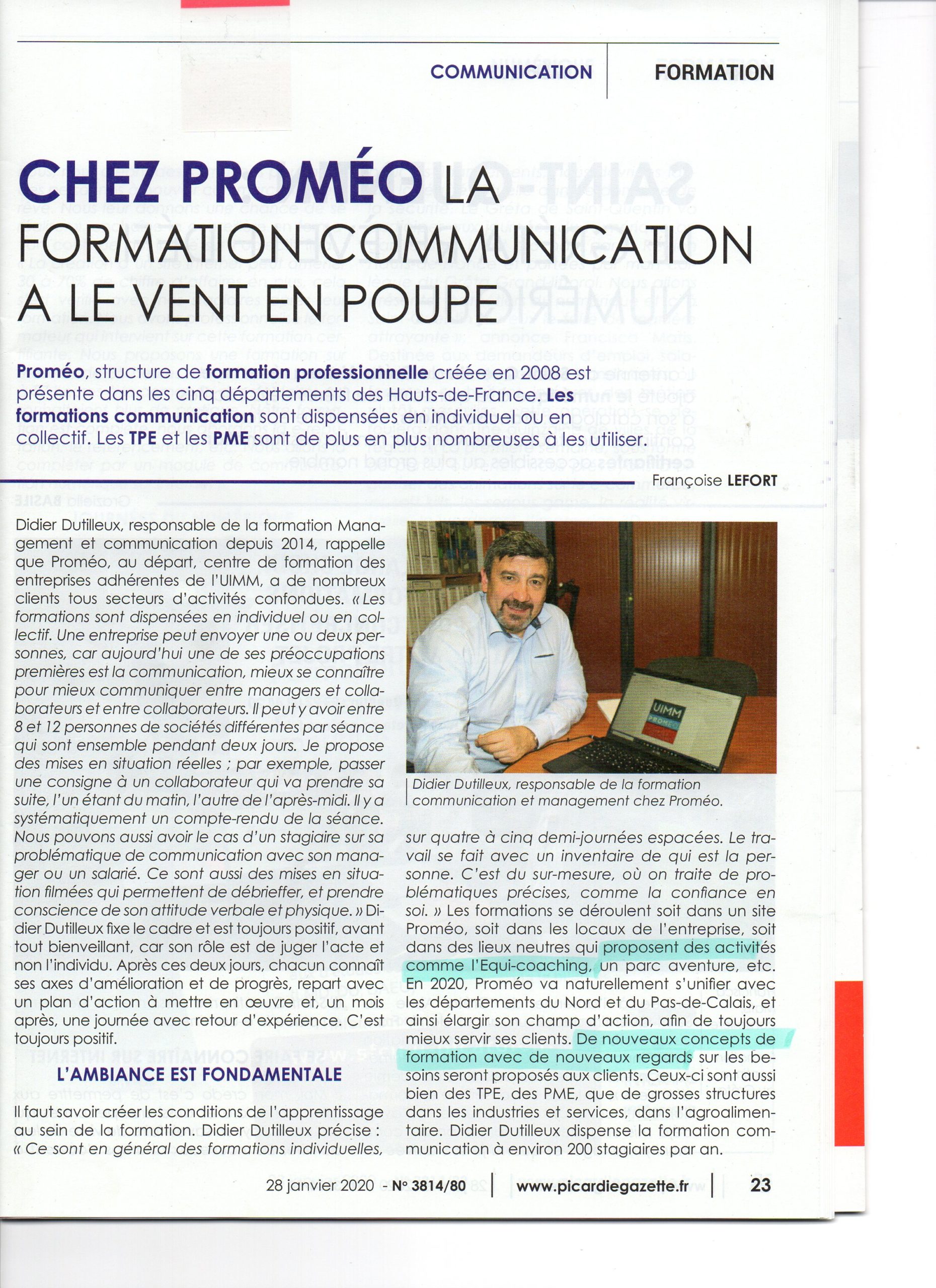Il faut savoir créer les conditions d’apprentissage au sein de la formation. Didier Dutilleux précise : « Ce sont en général des formations individuelles sur quatre à cinq demi-journées espacées. Le travail se fait avec un inventaire de qui est la personne. C’est du sur-mesure, où on traite de problématiques précises, comme la confiance en soi ». Les formations se déroulent soit dans un site Proméo, soit dans les locaux de l’entreprise, soit dans des lieux neutres qui proposent des activités comme l’équicoaching, un parc d’aventure, etc. En 2020, Proméo va naturellement s’unifier avec les départements du Nord et du Pas-de-Calais, et ainsi élargir son champ d’action, afin de toujours mieux servir ses clients. De nouveaux concepts de formation avec de nouveaux regards sur les besoins seront proposés aux clients. Ceux-ci sont aussi bien des TPE, des PME, que de grosses structures dans les industries et services, dans l’agroalimentaire. Didier Dutilleux dispense la formation communication à environ 200 stagiaires par an – Article écrit par Françoise Lefort